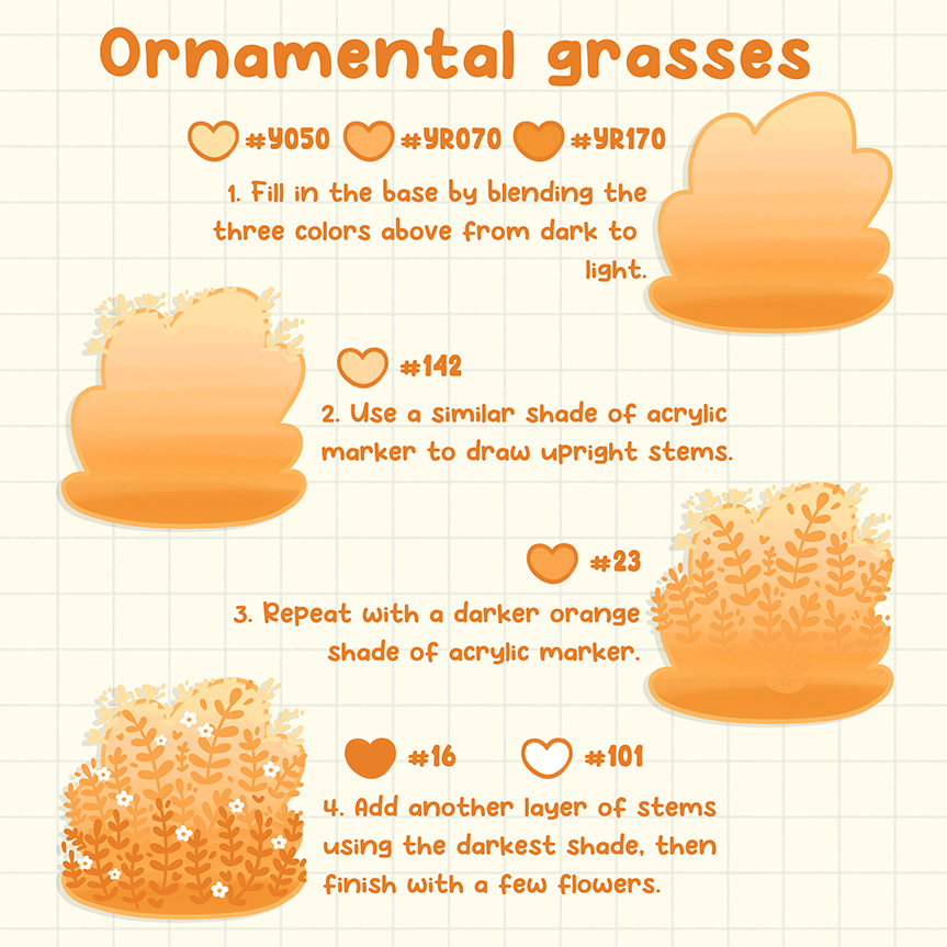 Then, use a white marker to dot tiny flowers. These white spots create a "sparkling" effect in the sunlight, highlighting the vibrancy of the grass clump.