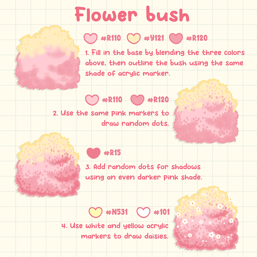 Blend 3 colors: pink and yellow, to create a soft, "cloud like" color base. Let the yellow concentrate at the top to simulate light. Then, use the same acrylic markers to draw a soft outline, shaping the bush without creating harsh borders.