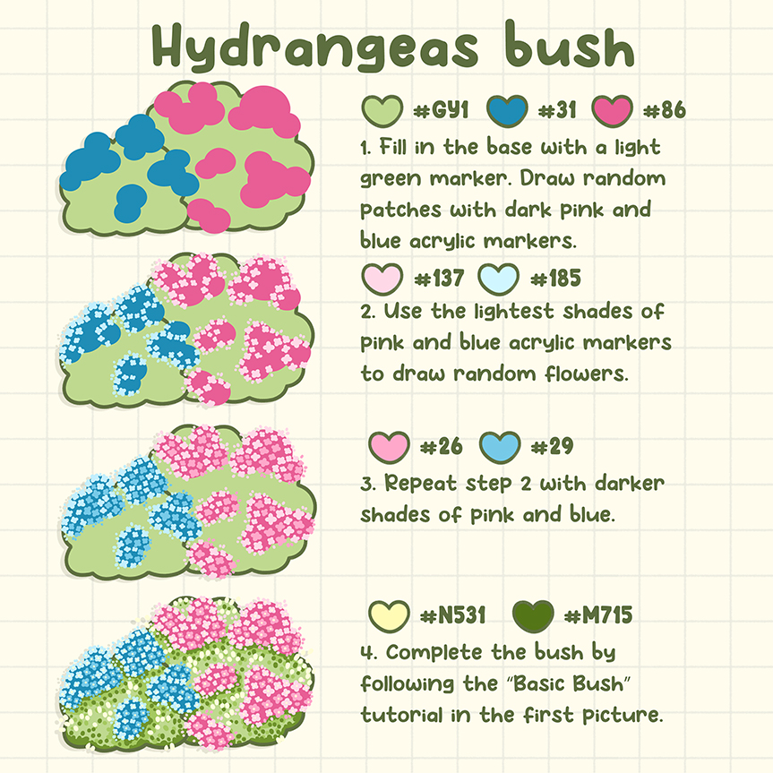 Apply the technique from the Basic Bush: dot a few shimmering yellow spots and deep green shadows, which will help your hydrangeas blend into the harmony of the garden.