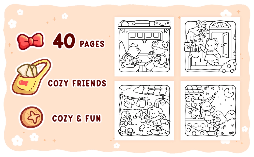 | Content | Focuses on a theme of cute animals in cozy scenes, easy to color yet full of creative inspiration |