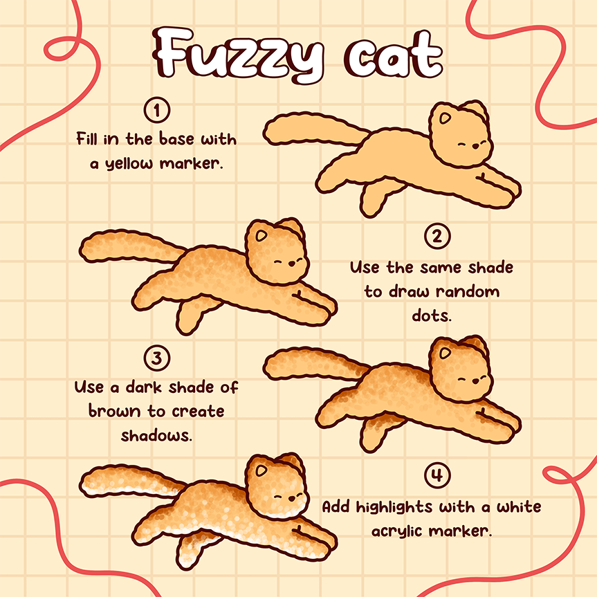 - Stippling for Texture: Use the same yellow/orange to create small, random dots or stipples over the cat's body. This breaks up the flat color and introduces the feeling of fuzzy, dappled hair. Stipple more densely in the center of the body and less so towards the edges.