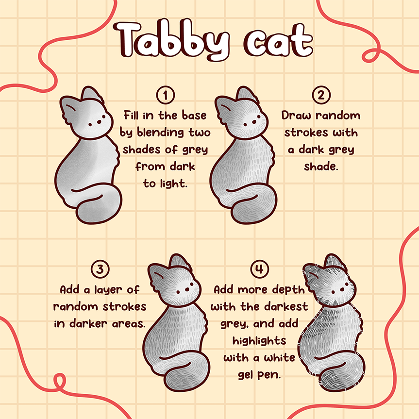- Deep Shadows & Density: Add more strokes using the darkest gray in areas where you want deep shadow. The strokes in the darker areas should be denser and closer together, creating the woven effect of tabby fur.