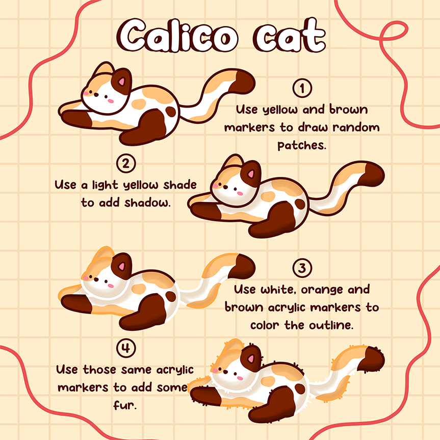 - Defining the Edges: Use a white, orange, and brown acrylic/paint marker to lightly outline the edges of the patches and the main outline. This border layer will make the fur look thicker. The outline color should match the nearest fur color.