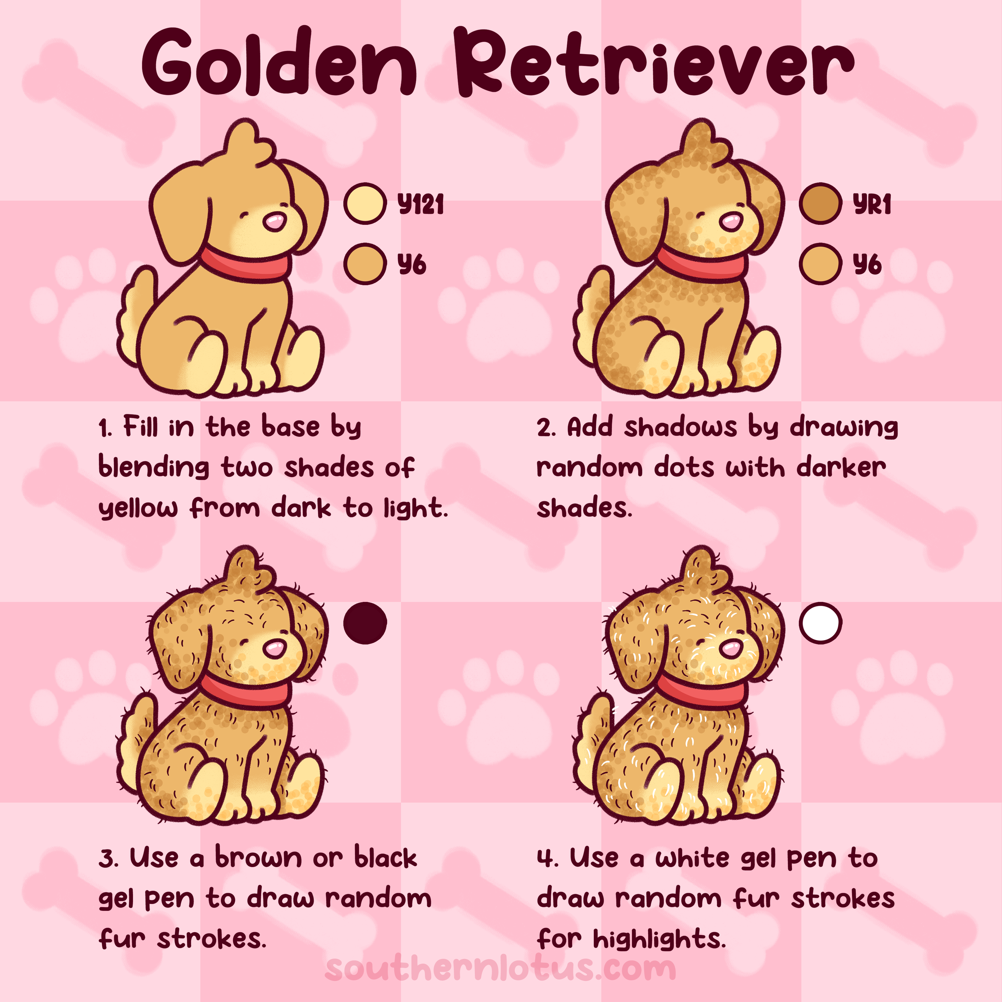 - Step 4: Use a white gel pen to draw very small, fine fur strokes on the light areas. Concentrate these strokes on the top of the head, back, and shoulders to mimic sunlight shining, creating a sheen on the golden coat.