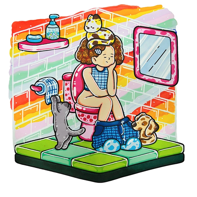 - Cozy bathroom illustration with a cute girl and dog