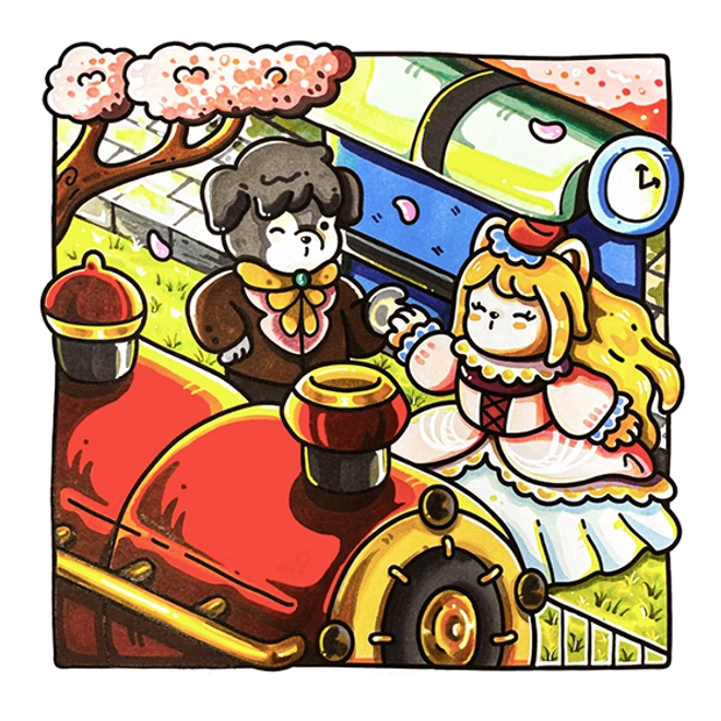 This illustration captures the gentle charm of quiet travels - a soft, peaceful moment at the station as characters prepare for their cozy journey. Rich retro details, warm textures, and whimsical elements make this page perfect for anyone who loves hygge coloring books aesthetic, cute characters, and nostalgic storytelling vibes.