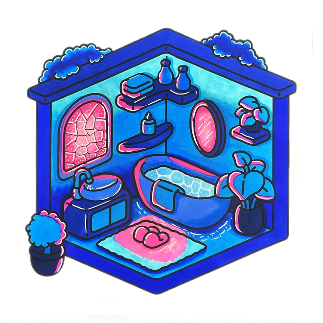 - Features a cute, cozy miniature bathroom scene