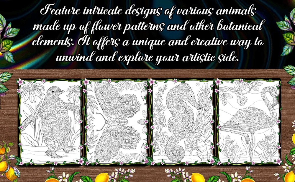 This book is a beautiful coloring book that combines the elegance of flowers with the grace of animals. This book features intricate illustrations of different animals such as butterflies, birds, and even foxes, intertwined with various types of flowers. The drawings are incredibly detailed, making each page a delightful challenge for coloring enthusiasts of all ages. This coloring book is an ideal gift for anyone who loves animals and the beauty of nature.