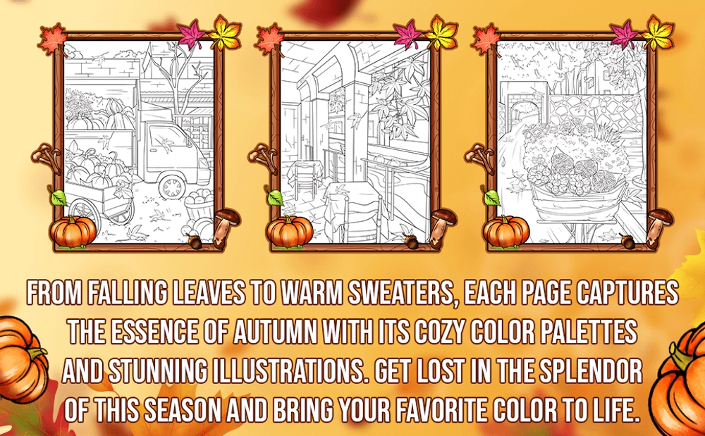 Experience the beauty of fall with this delightful coloring book. From rustling leaves to warm sweaters, this book captures the essence of autumn with its intricate illustrations and cozy color palettes. Get lost in the splendor of this season and bring your favorite color to life.