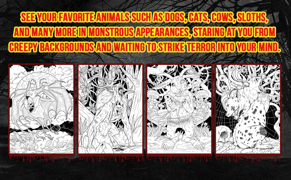 Through 30+ pages, you will see your favorite animals such as dogs, cats, cows, sloths, and many more in monstrous appearances and twisted forms, staring at you from creepy backgrounds and waiting to strike terror into your mind.