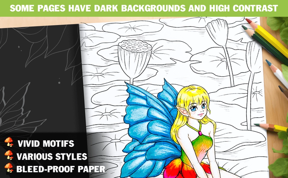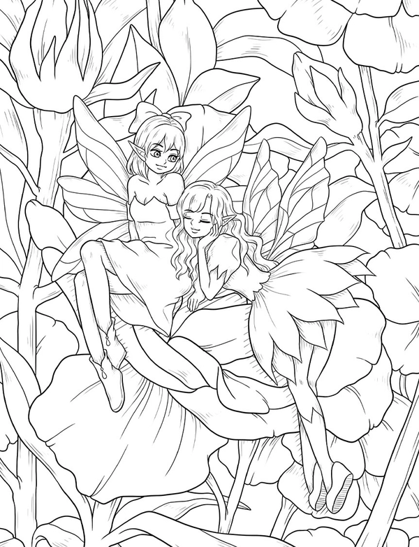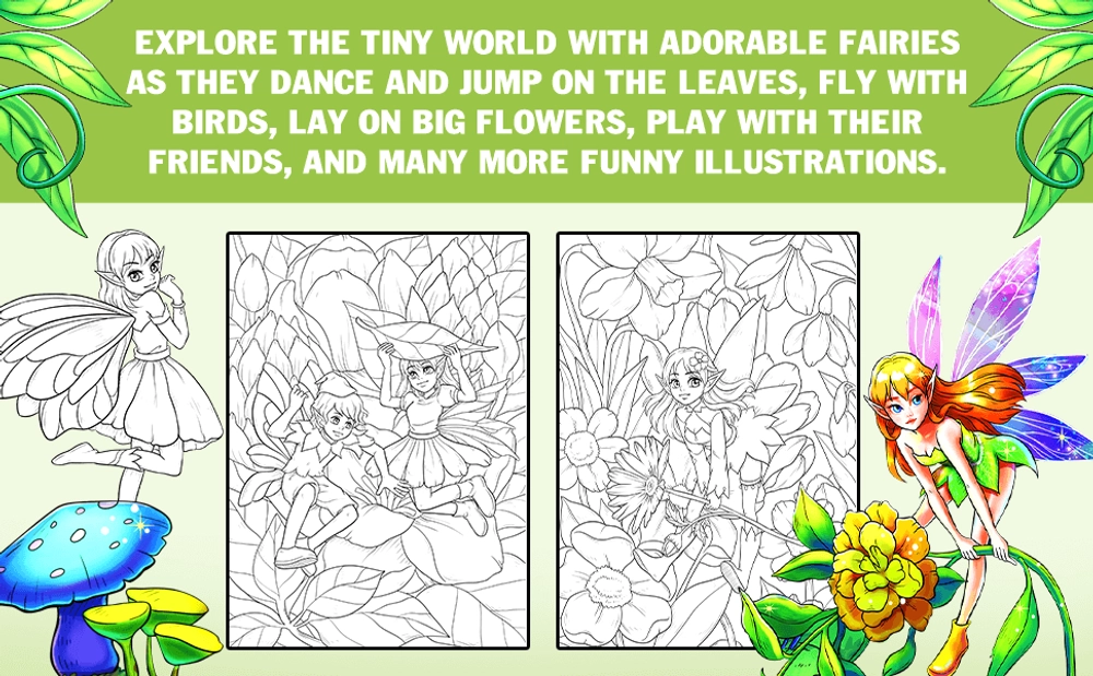 If you are a big fan of cute fairies, this coloring book is your destination. Every page features intricate details of the tiny fairies expressed through stunning and adorable illustrations. They are jumping on the leaves, flying with birds, laying on big flowers, or playing with their friends.
