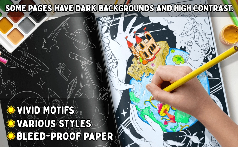 - Vivid images: black-and-white paper with various artistic illustrations and stunning designs.