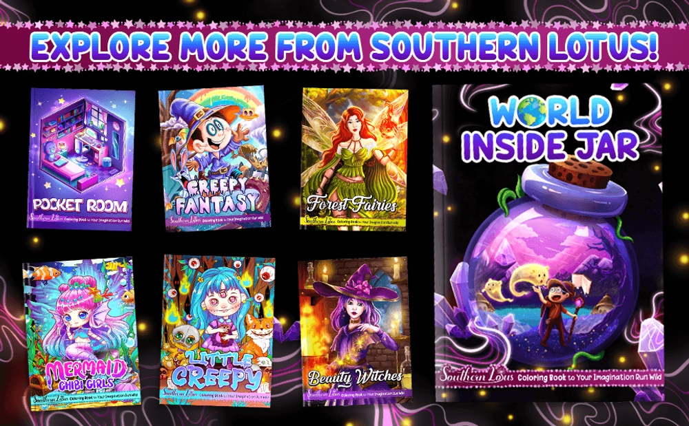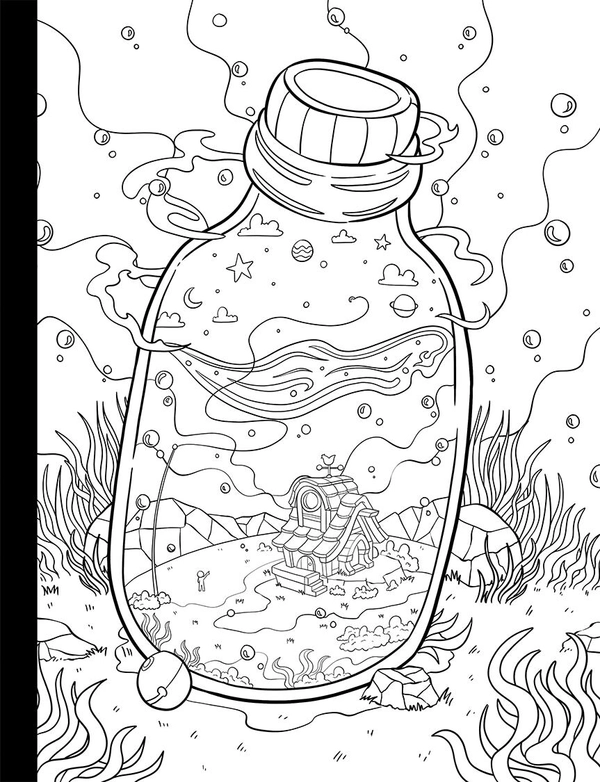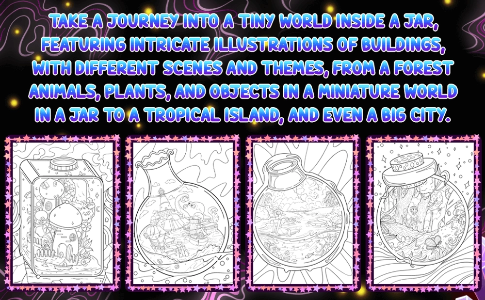 This coloring book takes you on a journey into a world inside a jar, featuring intricate illustrations of animals, plants, and objects in a miniature world. Each page showcases different scenes and themes, from a forest in a jar to a tropical island, and even a circus. This book is amazing for those who love fantasy and imaginative illustrations.